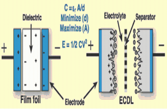 圖2 在結(jié)構(gòu)上,超級電容器和電池或電解電容器的主要區(qū)別是電極材料