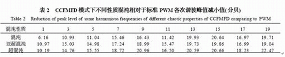 從表中給出的以標(biāo)準(zhǔn)周期PWM前19次諧波為參照的數(shù)據(jù)可以看出,分別在混沌、亞超混沌及超混沌信號(hào)調(diào)制下,各次諧波對(duì)應(yīng)處的頻譜數(shù)值都得到了明顯的降低。在混沌信號(hào)調(diào)制下,諧波對(duì)應(yīng)處的頻譜數(shù)值平均降低14.87分貝(dB);在亞超混沌信號(hào)調(diào)制下,諧波對(duì)應(yīng)處的頻譜數(shù)值平均降低16.84分貝(dB);在超混沌信號(hào)調(diào)制下,諧波對(duì)應(yīng)處的頻譜數(shù)值平均降低17.86分貝(dB)。若以歐盟(89/336/EEC指令)電磁兼容性導(dǎo)則中限制設(shè)備輸入電流諧波分量最大值幅度這一原則,來(lái)討論不同性質(zhì)混沌信號(hào)降低電磁干擾水平的效果,結(jié)論非常明顯,即以超混沌信號(hào)作為開(kāi)關(guān)調(diào)制信號(hào)源,比混沌能更好地降低電磁干擾水平。