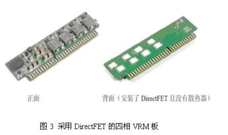 為了演示此項(xiàng)新型封裝工藝在VRM設(shè)計(jì)中所帶來的好處,我們利用DirectFET MOSFET設(shè)計(jì)了一個(gè)高電流四相VRM。6層電路板的每一層采用了4盎司銅箔。其四相控制器和驅(qū)動(dòng)器的工作速度可高達(dá)2MHz/相位。為減小外形尺寸,該設(shè)計(jì)的輸入和輸出濾波器均采用了陶瓷電容器,電感器則采用了一個(gè)400nH的高電流、小占位面積線圈(10mm×10mm)。