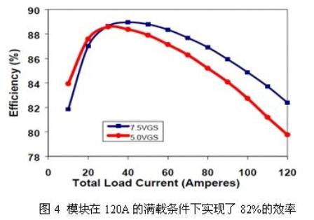 我們在室溫環(huán)境中對采用600LFM的空氣流量以及在500kHz頻率下工作的模塊進(jìn)行了內(nèi)電路效率測量。如圖4所示,模塊在120A的滿載條件下實(shí)現(xiàn)了82%的效率。根據(jù)工作頻率來優(yōu)化柵極驅(qū)動(dòng)電壓是很重要的。