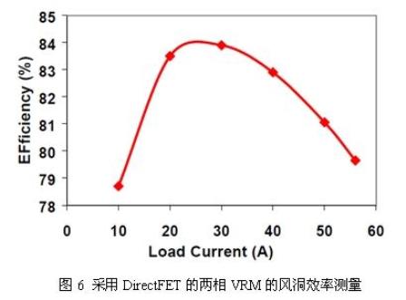 圖6給出了當(dāng)環(huán)境溫度為35℃、空氣流量為400LFM時(shí)在風(fēng)洞中測得的兩相VRM板的效率曲線圖。由圖可見,VRM在負(fù)載電流高達(dá)25A/相位的情況下獲得了80%以上的效率。