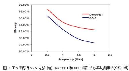 圖7示出了工作于兩相VRM電路中的DirectFET和SO-8器件的效率與頻率的關(guān)系曲線。兩者的效率測量都是在20A/相位的負(fù)載電流條件下進(jìn)行。在整個(gè)頻譜范圍內(nèi),采用DirectFET的VRM電路表現(xiàn)出高于采用SO-8的VRM電路的效率水平。兩種電路的效率差異還會(huì)隨著頻率的升高而增大。該結(jié)果反映出DirectFET器件的封裝寄生損耗較SO-8器件低。DirectFET封裝器件還能夠在更高的負(fù)載電流條件下工作。例如,在1MHz條件下,DirectFET VRM電路能夠?qū)Ω哌_(dá)30A/相位的負(fù)載電流進(jìn)行開關(guān)操作,并同時(shí)將電路板的溫度維持在100℃以下。而在相同的工作條件下,SO-8器件則只能對20A/相位左右的負(fù)載電流進(jìn)行開關(guān)操作。DirectFET VRM電路較高的電流處理能力可歸功于結(jié)合了更低的封裝寄生效應(yīng)以及更高的熱