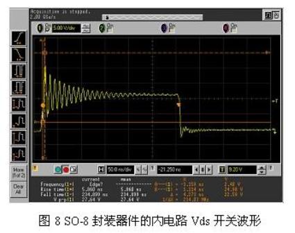 圖8示出的是SO-8器件對30A電流進(jìn)行開關(guān)操作時(shí)的波形,