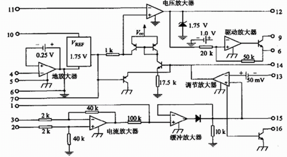 UC3907的內(nèi)部結(jié)構(gòu)如圖1所示??煞譃殡妷涵h(huán)與電流環(huán)(包括均流控制) 兩部分。其中電壓環(huán)由電壓放大器、接地放大器和驅(qū)動(dòng)放大器構(gòu)成。電流環(huán)由電流放大器、緩沖放大器、調(diào)節(jié)放大器和狀態(tài)指示構(gòu)成。