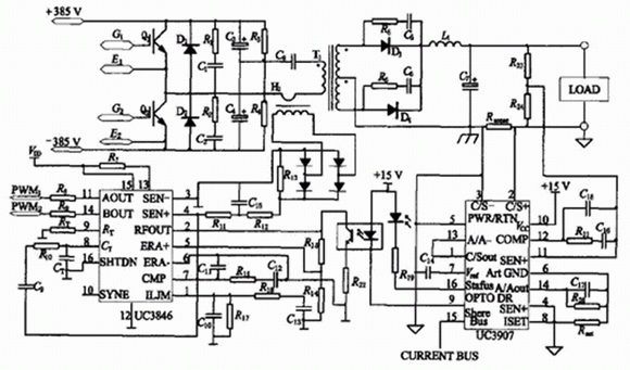 因?yàn)殡娫床⒙?lián)在一起, 很難達(dá)到輸出電流分配均勻, 所以并聯(lián)電源模塊間必須采用均流措施。某DC/DC變換器要求: 輸入電壓為385V, 輸出電壓38V, 輸出電流為100A, 必要時(shí)多臺(tái)開關(guān)穩(wěn)壓電源可以直接并聯(lián)使用, 并聯(lián)使用時(shí)的負(fù)載不均衡度小于5%。DC/DC變換器主電路采用半橋式電路拓?fù)?控制芯片采用TI公司生產(chǎn)的電流控制型PWM集成控制芯片UC3846, 在比較幾種均流控制方案的基礎(chǔ)上, 選擇了根據(jù)最大電流自動(dòng)均流法而設(shè)計(jì)的UC3907 均流控制芯片, 實(shí)現(xiàn)了并聯(lián)運(yùn)行時(shí)均流控制。電源模塊在并聯(lián)時(shí), 取得較好的均流效果。
