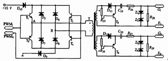 該系統(tǒng)主電路的開關(guān)管使用IGBT, 用脈沖變壓器作驅(qū)動(dòng)。當(dāng)IGBT容量較小時(shí)UC3846的11腳和14腳可以直接驅(qū)動(dòng)變壓器; 當(dāng)IGBT容量較大時(shí), 可以采用圖3所示的驅(qū)動(dòng)電路。該驅(qū)動(dòng)電路結(jié)構(gòu)簡(jiǎn)單, 具有負(fù)壓關(guān)斷能力, 且驅(qū)動(dòng)功率大。電路中, 二極管D9、D10有助于T1~T4的關(guān)斷。