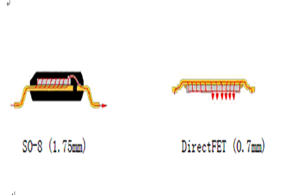 傳統(tǒng)的MOSFET使用引線鍵合來實現(xiàn)硅片和管腳框架之間的電連接,而DirectFET,將接觸面的數(shù)目和傳導路徑的長度減到最小從而減小了傳導損耗。