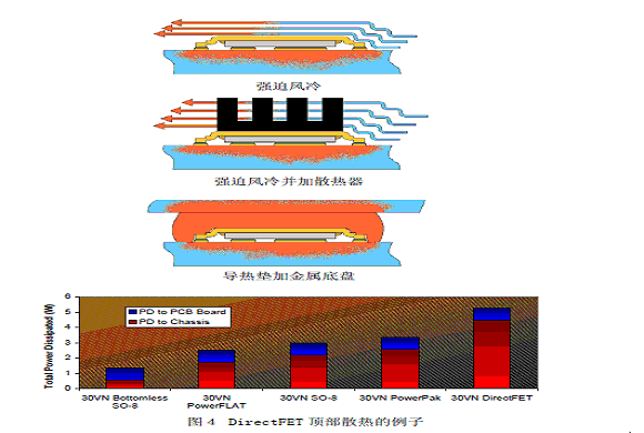 DirectFET封裝的頂部金屬漏極連接為芯片的結和頂部封裝之間提供了一條較低的熱阻抗路徑使結到殼的熱阻只有3°C/W 。這就使得器件的散熱方法與以往有很大不同,可以用強迫風冷或導熱的填充介質將熱傳到一個適當接地的散熱器上。圖4舉例說明了這些概念。