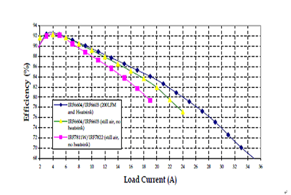 在一個12V輸入,1.3V輸出,工作頻率300kHZ的同步降壓變換器中,我們將IRF6603/IRF6604和IRF7822/IRF7811W這兩對管子做以比較,它們使用的硅片技術是相同的。負載電流增加時,此變換器電路板的溫度不得超過105°C。當電流達到18A時,這是SO8封裝在無冷卻氣流的條件下能夠承受的大電流,IRF6603的結溫要低50°C。比較DirectFET和SO-8在靜止空氣無散熱器條件下的效率曲線,在18A時前者的效率要高出3%。