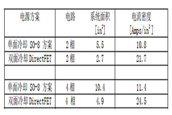 為了計算方便,假設單面冷卻的器件被限制在0.5 in2 的PCB板內,我們知道設計者往往用到1in2 以盡可能增加SO8的輸出電流。DirectFET器件布置在最小的管腳尺寸內。下表給出了論證結果,表明在大電流DC-DC變換器中,雙面散熱的DirectFET的電流密度能比單面散熱的SO8的增加一倍。
