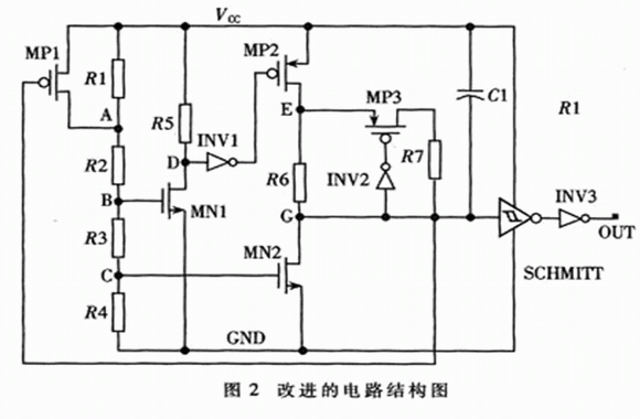 改進(jìn)的電路如圖2所示,電路結(jié)構(gòu)由采樣、先導(dǎo)控制、比較器、遲滯反饋回路、加速響應(yīng)電路、緩沖器六部分構(gòu)成。電阻R1、R2、R3、R4構(gòu)成分壓電阻網(wǎng)絡(luò)實(shí)現(xiàn)對(duì)Vcc的采樣;MNl、R5、INVl組成先導(dǎo)控制電路,實(shí)現(xiàn)對(duì)比較器灌電流的控制;MN2、R6、MP2組成比較器,實(shí)現(xiàn)采樣電壓與MN2的VTH比較;MP1構(gòu)成正反饋回路,可實(shí)現(xiàn)Vcc的遲滯功能;INV2、MP3、R7構(gòu)成正反饋回路,可加速比較器的翻轉(zhuǎn),從而提高電路的響應(yīng)速度;SCHMITT觸發(fā)器和INV3是緩沖電路,對(duì)比較器的輸出波形進(jìn)行緩沖和整形,SCHMITT觸發(fā)器的結(jié)構(gòu)如圖3所示,其工作原理詳見參考文獻(xiàn)[3];另外,電容C1起濾波和儲(chǔ)能作用。