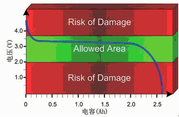 一旦電壓超出允許范圍,鋰電池很容易被損壞(見圖1)。如果超出電壓的上限和下限(例如,nanophosphate鋰電池的電壓上限和下限分別為3.6V和2V),電池就可能會受到不可逆的損壞,至少也會增加電池的自放電率。在相當寬的荷電狀態(tài)范圍內,輸出電壓可以保持穩(wěn)定,因此正常情況下超出安全范圍的可能性比較小。但是,在接近安全范圍上限和下限的區(qū)域,變化曲線非常陡峭。作為預防措施,仔細監(jiān)測電壓水平非常必要。