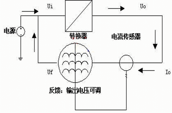 在能量反饋部分就要能實現(xiàn)上述要求,保證穩(wěn)定的電能轉(zhuǎn)換器的輸出電流,采用電流傳感器檢測電能轉(zhuǎn)換器的輸出電流,同時反饋部分采用反饋電壓與輸出控制電流之間成反比系數(shù)關(guān)系即Uf∝K/Io,為便于分析,設(shè)電源電壓Ui為穩(wěn)定值。當輸出電流較小時,通過調(diào)節(jié)反饋電壓,使其變大,則反饋電壓與輸入的電壓差△U=Uf-Ui變大, 相應(yīng)的由反饋電壓流向輸入電壓的電流加大,造成相應(yīng)的反饋功率加大;當輸出電流較大時,通過調(diào)節(jié)反饋電壓,使Uf變小,則反饋電壓與輸入的電壓差△U變小,相應(yīng)的由反饋電壓流向輸入電壓的電流減小,造成循環(huán)的功率減小;整個過程維持負反饋控制,最終達到動態(tài)平衡,維持設(shè)定的額定功率。