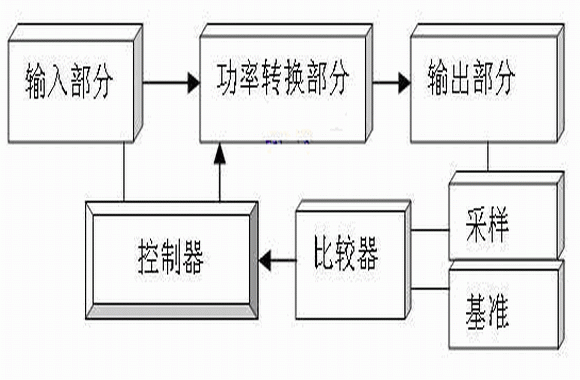 從以上能量反饋系統(tǒng)工作分析可知,能量反饋部分為系統(tǒng)穩(wěn)定工作提供必要的保證, 能量反饋部分組成可由圖5所示,主要包括:輸入部分、功率轉(zhuǎn)換部分、輸出部分、采樣、基準、比較器和控制器七個組成部分。