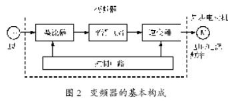 圖2所示為變頻器的基本構(gòu)成。它的基本原理是用一種特定的方式對(duì)變頻器中的晶閘管開關(guān)進(jìn)行導(dǎo)通和關(guān)斷,直接把輸入的電壓波形“大致”調(diào)制成所需頻率的交流波形。