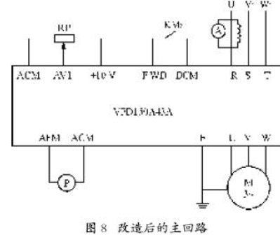由于這是對(duì)舊設(shè)備進(jìn)行改造,所以在改造中充分考慮并照顧操作人員的操作習(xí)慣,保持原有的工作順序不變。根據(jù)操作人員的實(shí)際需要,重新設(shè)計(jì)了主回路及控制回路。用電位器給定頻率,控制電動(dòng)機(jī)的轉(zhuǎn)速,實(shí)現(xiàn)無級(jí)調(diào)速。用一轉(zhuǎn)速表顯示電動(dòng)機(jī)的實(shí)際轉(zhuǎn)速,給操作人員提供可靠的操作依據(jù)。