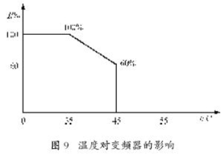 變頻器主要由各種電子元器件組成,它對(duì)于工作環(huán)境的要求較高,當(dāng)環(huán)境溫度超過它的最高工作溫度時(shí),變頻器必然會(huì)降低其持續(xù)電流輸出的額定值,如圖9所示。