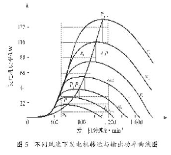 風(fēng)力機(jī)通過葉輪來捕獲流動(dòng)的風(fēng)能,風(fēng)的能量轉(zhuǎn)化為葉輪旋轉(zhuǎn)的動(dòng)能,齒輪箱再把這種機(jī)械能傳輸?shù)桨l(fā)電機(jī),由發(fā)電機(jī)通過內(nèi)部的電磁關(guān)系將機(jī)械能變?yōu)殡娔茌敵?。圖5為在不同風(fēng)速下,葉輪轉(zhuǎn)速與風(fēng)力機(jī)輸出功率的關(guān)系圖。由圖可知,對(duì)應(yīng)于每個(gè)風(fēng)速的曲線,都有一個(gè)最大輸出功率點(diǎn),風(fēng)速越高,輸出功率越高,相應(yīng)的葉輪轉(zhuǎn)速也越高。因此,如果能隨風(fēng)速變化改變?nèi)~輪轉(zhuǎn)速,使得風(fēng)力機(jī)在所有風(fēng)速下都工作于最大功率輸出點(diǎn),則發(fā)出電能最多,否則發(fā)電效能將降低。