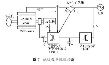上海南洋電機(jī)廠采用ACS800-67 變頻器構(gòu)建雙饋風(fēng)力發(fā)電機(jī)的實(shí)驗(yàn)平臺(tái),風(fēng)力機(jī)采用直流電動(dòng)機(jī)模擬,即雙饋發(fā)電機(jī)轉(zhuǎn)子靠直流電動(dòng)機(jī)拖動(dòng)。系統(tǒng)連接示意圖如圖7所示。技術(shù)數(shù)據(jù)如下:發(fā)電機(jī)定子額定電壓690 V,定子額定電流1500A,額定頻率50 Hz,額定功率1 345kW,額定轉(zhuǎn)速1 513 r/min,同步轉(zhuǎn)速1 500 r/min,功率因數(shù)0.9,轉(zhuǎn)子開路電壓1990V,轉(zhuǎn)子電流550A;變頻器型號(hào)ACS800-67-0480/0770-7,調(diào)速范圍±30%。