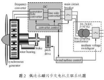 目前流行的變速變槳風(fēng)力發(fā)電機(jī)組的動(dòng)力驅(qū)動(dòng)系統(tǒng)主要兩種方案:一種是升速齒輪箱+繞線式異步電動(dòng)機(jī)+雙饋電力電子變換器;另一種是無齒輪箱的直接驅(qū)動(dòng)低速永磁發(fā)電機(jī)+全功率變頻器。兩種方案各有優(yōu)缺點(diǎn):前者采用高速電機(jī),體積小重量輕,雙饋?zhàn)兞髌鞯娜萘績H與電機(jī)的轉(zhuǎn)差容量相關(guān),效率高、價(jià)格低廉,缺點(diǎn)是升速齒輪箱價(jià)格貴,噪音大、易疲勞損壞;后者無齒輪箱,可靠性高,但采用低速永磁電機(jī),體積大,造價(jià)高,變頻器需要全功率,成本提高。