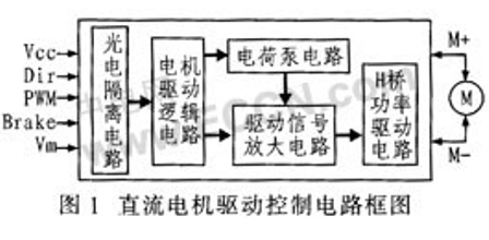 直流電機驅(qū)動控制電路分為光電隔離電路、電機驅(qū)動邏輯電路、驅(qū)動信號放大電路、電荷泵電路、H橋功率驅(qū)動電路等四部分,其電路框圖如圖1所示。