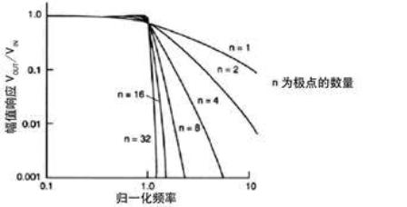 圖1 幾個低通濾波器的幅值響應(yīng)與歸一化頻率的關(guān)系曲線。如果濾波器傳遞函數(shù)有多個極點(或階數(shù)),則頻率越高,衰減越快。