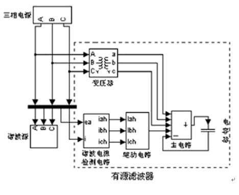 該有源濾波器主要由諧波電流檢測電路、驅(qū)動電路、主電路、電容器和變壓器5大部分組成。變壓器的設(shè)置主要是為調(diào)節(jié)有源電力濾波器交流側(cè)電壓之用。其原理如圖1所示。其中的諧波源模塊是根據(jù)主提升機(jī)房實(shí)際諧波測試數(shù)據(jù)建成的。