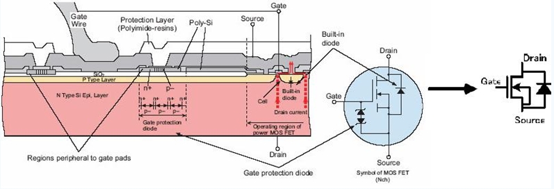 在MOS管原理圖上可以看到,漏極和源極之間有一個(gè)寄生二極管。這個(gè)叫體二極管,在驅(qū)動(dòng)感性負(fù)載(如馬達(dá)),這個(gè)二極管很重要。順便說一句,體二極管只在單個(gè)的MOS管中存在,在集成電路芯片內(nèi)部通常是沒有的。下圖是MOS管的構(gòu)造圖,通常的原理圖中都畫成右圖所示的樣子。 (柵極保護(hù)用二極管有時(shí)不畫)