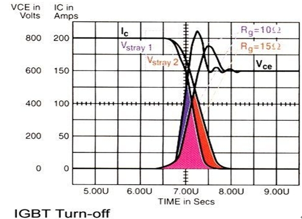 每個IGBT開關(guān)特性的設定可受外部電阻RG的影響。由于IGBT的輸入電容在開關(guān)期間是變化的,必須被充放電,柵極電阻通過限制導通和關(guān)斷期間柵極電流(IG)脈沖的幅值來決定充放電多長時間(見圖1)。由于柵極峰值電流的增加,導通和關(guān)斷的時間將會縮短且開關(guān)損耗也將會減少。減小RG(on)和RG(off)的阻值會增大柵極峰值電流。當減小柵極電阻的阻值時,需要考慮的是當大電流被過快地切換時所產(chǎn)生的電流隨時間變化特性di/dt。電路中存在雜散電感在IGBT上產(chǎn)生大的電壓尖峰。這一效果可在圖2所示的IGBT關(guān)斷時波形圖中觀察到。圖中的陰影部分顯示了關(guān)斷損耗的相對值。集電極-發(fā)射極電壓上的瞬間電壓尖峰可能會損壞IGBT,特別是在短路關(guān)斷操作的情況下,因為di/dt比較大??赏ㄟ^增加柵極電阻的值來減小Vstray。因此,消除了由于過電壓而帶來的IGBT被損毀的風險。快速的導通和關(guān)斷會分別帶來較高的dv/dt和di/dt,因此會產(chǎn)生更多的電磁干擾(EMI),從而可能導致電路故障。表1顯示不同的柵極電阻值對di/dt的影響。