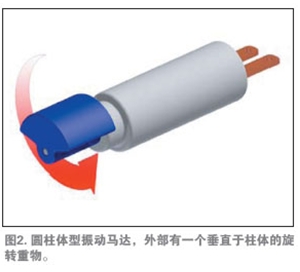 柱型馬達(dá)是采用傳統(tǒng)軸向設(shè)計(jì)的簡單有刷電機(jī),如圖2所示。用于多種應(yīng)用中,但由于體積較大,不適合在手機(jī)中應(yīng)用。柱型馬達(dá)在手機(jī)中需要較大的空間,直徑是所有振動(dòng)馬達(dá)中最大的。