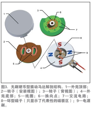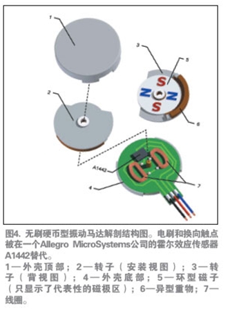如前所述,無刷電機(jī)具有較長的壽命,并由于產(chǎn)生的電火花較少,也沒有了RFI干擾。無刷直流(BLDC)設(shè)計(jì)還提供業(yè)內(nèi)直徑最小、厚度最薄的扁平振動(dòng)馬達(dá)。圖4介紹了這種馬達(dá)的基本構(gòu)造。