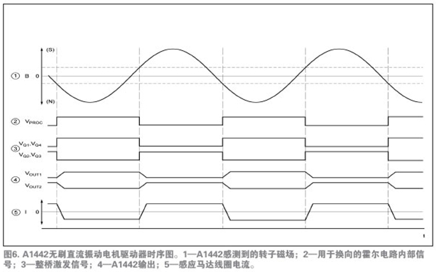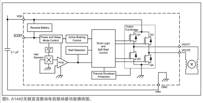 A1442是驅(qū)動(dòng)馬達(dá)唯一必須的的IC。圖5所示的功能模塊圖說明了設(shè)備運(yùn)行和先進(jìn)的特性。注意圖4和圖5中,采用集成的霍爾傳感器免除了外部霍爾傳感器,從而減少了馬達(dá)PCB元件數(shù)量。唯一所需的外部元件是一種標(biāo)準(zhǔn)電路特性——位于應(yīng)用馬達(dá)安裝PCB上的0.1µF的旁路電容,它用于降低在開關(guān)電源的電感負(fù)載時(shí)產(chǎn)生的瞬時(shí)電壓峰值。