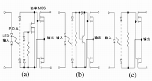 在該電路中,與輸入LED進行光耦合的光電二極管陣列,接受輸入信號發(fā)光產(chǎn)生的光電流,通過偏置電阻使N.C.元件處于開放狀態(tài)。這樣同時具備(c)電路中第2光電二極管陣列的作用。