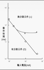 通過旁路元件,使偏置電阻兩端的電位下降控制在一定閾值以下,與偏置電阻的大小無關(guān),起到使光電流高效率流入電路的作用。該旁路元件插入電路的情況及相反的情況下的輸入電流-動作時間的特性如圖6所示。