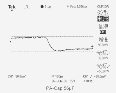 4、當(dāng)測試電容采用(PA-Cap)聚合物片式疊層鋁電解電容器CT=56μF ESR=23mΩ時(shí),輸出電壓下跌值為90mV。