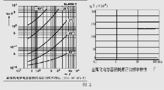 而鋁電解電容器的損耗非常大,其中用功損耗可以占到總無功容量的20%,且鋁電解電容器有功損耗隨著頻率的增大而增大,頻率超過1000赫茲損耗變化率逐漸增大,當(dāng)頻率超過10000赫茲后變化率急劇增加,有功損耗增大,發(fā)熱量增大。圖2中顯示了鋁電解電容器損耗頻率特性(國外某著名鋁電解電容器生產(chǎn)公司提供),這也正是長久以來在中、高頻大功率環(huán)境下采用鋁電解直流濾波電容器發(fā)熱量大、故障率高的根本原因。而金屬化電容器固有損耗非常小,整臺(tái)電容器損耗小于2‰,僅為鋁電解電容器1%,且采用聚丙烯薄膜作為介質(zhì),產(chǎn)品頻率特性很穩(wěn)定,如圖2所示,故在中、高頻環(huán)境下采用金屬化直流濾波電容器,可以大幅度降低線路損耗,避免發(fā)熱,穩(wěn)定性非常高。
