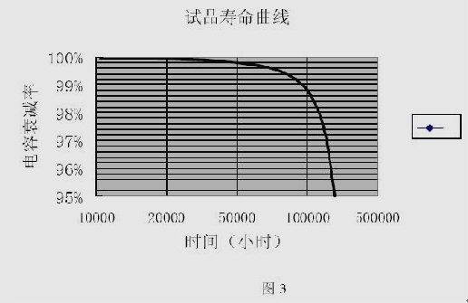 根據(jù)上述因素,鋁電解電容器在中、高頻環(huán)境下使用故障率非常高、壽命非常短,額定工況下預(yù)期壽命≤50000小時(shí)(如圖3),隨著工況的變化容量急劇變化,壽命降低,甚至由一些企業(yè)在中、高頻環(huán)境使用鋁電解電容器壽命不足10000小時(shí),常常由于電容器故障影響到整臺(tái)設(shè)備的使用。相反金屬化電容器在中、高頻環(huán)境使用,由于其良好的頻率、電流特性可以保證其安全長壽命,在額定工況下預(yù)期壽命≥80000小時(shí),且在壽命期內(nèi)隨環(huán)境的變化電氣性能基本保持不變,不影響電容器的壽命(如圖3),保證配套設(shè)備運(yùn)行安全可靠。
