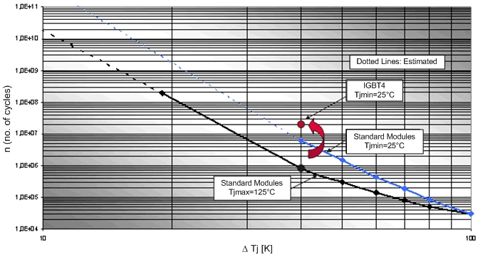 圖 1: 在接通時(shí)間約為1秒和電流約為標(biāo)稱電流條件下,1200V標(biāo)準(zhǔn)模塊使用壽命圖和EconoPACK模塊的典型使用壽命