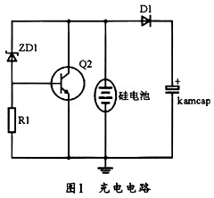 本系統(tǒng)中的充電電路由防過(guò)壓和防反充電路構(gòu)成,圖1所示為其充電電路,圖中的ZD1為5.6V穩(wěn)壓二極管,當(dāng)電池電壓高于5.6 V時(shí),Q2導(dǎo)通,硅電池全部電流通過(guò)電阻Q2消耗掉,當(dāng)硅電池電壓降到5.6 V以下時(shí),Q2截至,硅電池給超級(jí)電容充電,并同時(shí)保護(hù)超級(jí)電容。