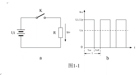 圖1-1-a是串聯(lián)式開關電源的最簡單工作原理圖,圖1-1-a中Ui是開關電源的工作電壓,即:直流輸入電壓;K是控制開關,R是負載。當控制開關K接通的時候,開關電源就向負載R輸出一個脈沖寬度為Ton,幅度為Ui的脈沖電壓Up;當控制開關K關斷的時候,又相當于開關電源向負載R輸出一個脈沖寬度為Toff,幅度為0的脈沖電壓。這樣,控制開關K不停地“接通”和“關斷”,在負載兩端就可以得到一個脈沖調制的輸出電壓uo 。