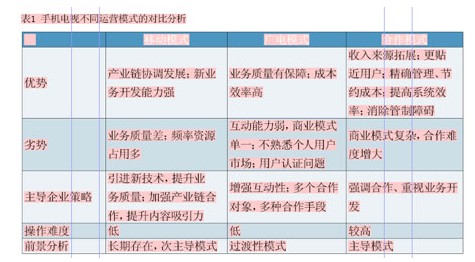 在手機電視運營模式上,應(yīng)以合作模式為主導(dǎo)模式,以移動模式為次主導(dǎo)模式,不同運營模式的對比分析見表1。
