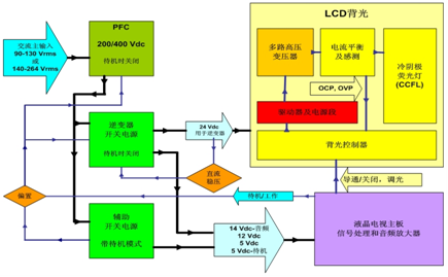 然而,對更佳視覺效果的追求也帶來了大大超過以往的功耗挑戰(zhàn)。較高的功率消耗不僅會(huì)增加消費(fèi)者的電費(fèi)開支,而且不配合各國節(jié)能降耗的宏觀推動(dòng)。各國政府都出臺(tái)了各種綠色能效指令,如美國“能源之星”3.0版電視規(guī)范、功率因數(shù)校正(PFC)規(guī)范等;消費(fèi)者也越來越關(guān)注小尺寸、多功能、節(jié)能省電等問題。在能效規(guī)范和環(huán)保意識(shí)的推動(dòng)下,電源設(shè)計(jì)也在不斷推陳出新。本文針對未來將占據(jù)全高清電視最大市場份額的較大尺寸液晶電視,探討有關(guān)的電源方案。
