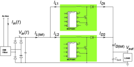 而在PFC方面,采用安森美半導(dǎo)體的NCP1606和NCP1654等PFC控制器,已經(jīng)可以將液晶電視厚度降到較低;為了支持低至10 mm的極纖薄設(shè)計(jì),可以采用兩顆相對較小的NCP1601芯片,用交錯(cuò)式架構(gòu)來來實(shí)現(xiàn),如圖3所示。交錯(cuò)式PFC是在原來放置單個(gè)較大PFC的地方并行放置兩個(gè)功率為一半的較小PFC。這兩個(gè)較小PFC以180°的相移交替工作,在輸入端或輸出端累加時(shí),它們可以抵消每相電流紋波的主要部分。