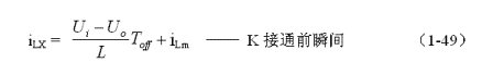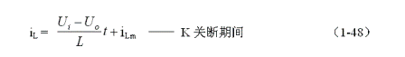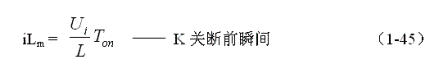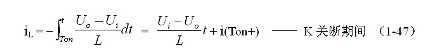 式中i(Ton+)為控制開(kāi)關(guān)K從Ton轉(zhuǎn)換到Toff的瞬間之前流過(guò)電感的電流,i(Ton+)也可以寫為i(Toff-),即:控制開(kāi)關(guān)K關(guān)斷或接通瞬間,之前和之后流過(guò)電感L的電流相等。實(shí)際上(1-47)式中的i(Ton+)就是(1-45)式中的iLm,因此,(1-9)式可以改寫為: