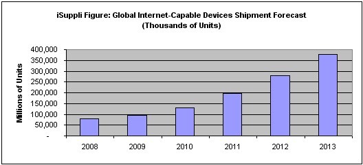 下圖為iSuppli對互聯(lián)網(wǎng)設(shè)備2008年至2013年期間全球出貨量的預(yù)測。