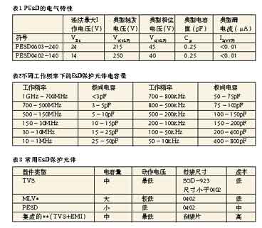 ESD元件最重要的參數(shù)是電容量。一般MLV的電容量是40~220pf,E系列的電容量是3~12pf;而PESD的電容量?jī)H為0.25pf。