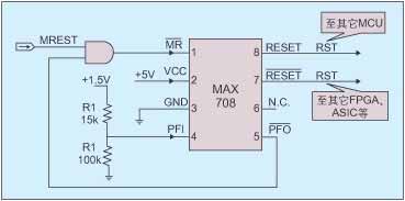 需要指出的是,MAX708本身可以監(jiān)控VCC電壓(這里為5V),這對電路采用多電源模塊的設(shè)計是很有用的。因為兩個電源模塊相互獨立,5V和1.5V可能不是源于同一個電源模塊,所以在監(jiān)控1.5V的同時也需要監(jiān)控5V電壓。