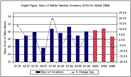 第三季度,iSuppli公司預測手機市場將恢復增長,銷售額將比第二季度上升7.8%。這種增長主要來源于訂單增加,此前訂單接近停滯。另外,庫存將上升5%左右。iSuppli公司預測,需求與庫存的相應增長將使庫存天數(shù)保持在30天左右。