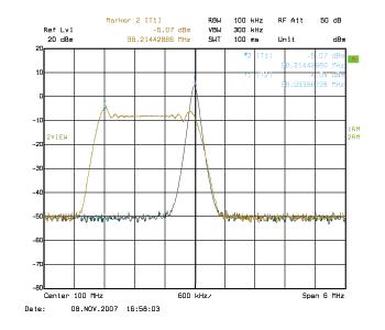 另一種可行解決方案是使用展頻振蕩器(Spread Spectrum Oscillator),來(lái)降低系統(tǒng)輻射出來(lái)的EMI電磁輻射干擾。圖4則顯示一個(gè)單頻信號(hào)的頻譜圖以及對(duì)該信號(hào)展頻后的頻譜圖。從圖中可知展頻后的頻率信號(hào)如何降低原來(lái)在接近100MHz的峰值。