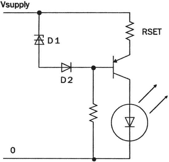相對簡單的方案是使用線性降壓穩(wěn)壓器(圖1),D1是一個穩(wěn)壓二極管,通過LED的電流設定為VD1/RSET。D2對基極二極管進行濕度補償。這個電路仍然存在能量損失問題和電阻散熱問題。對于低電流LED,尤其是串聯(lián)后的LED正向壓降和稍低于電源電壓的場合,這個電路不失為經(jīng)濟有效的方案。